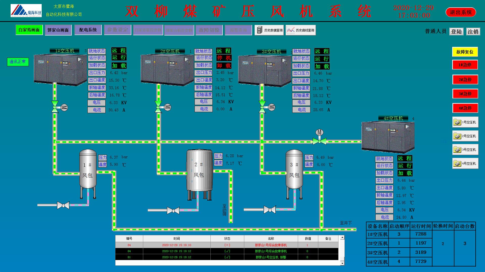 實現(xiàn)壓風(fēng)機(jī)方各重要設(shè)備運(yùn)行狀態(tài)實時監(jiān)測、故障報警與聯(lián)動控制